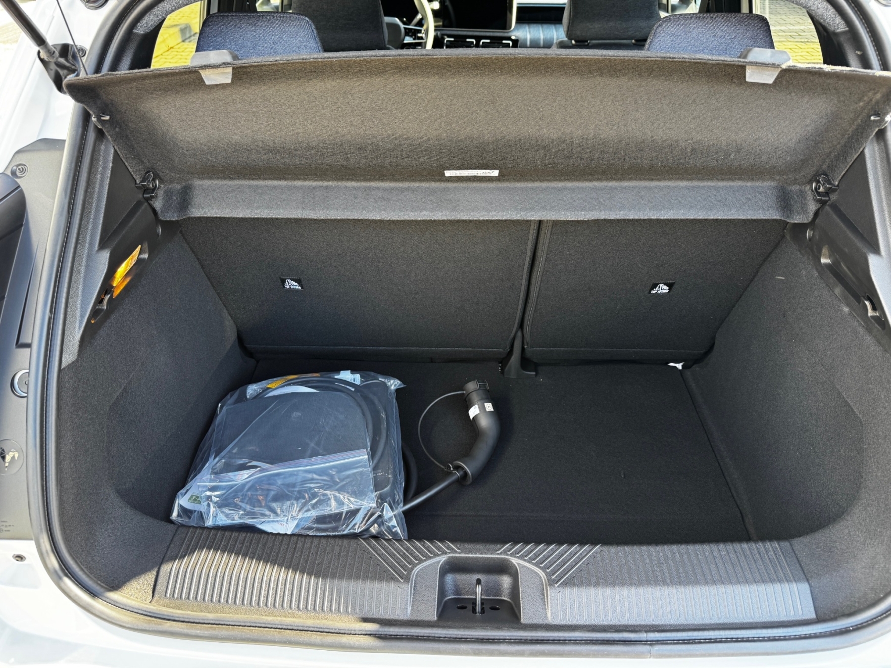 Nabíjanie: ukazovateľ stavu nabíjania na kapote. Komfort, funkcia rozpoznávania tváre (Face ID), volant potiahnutý umelou kožou, vysoká stredová konzola s lakťovou opierkou. Dizajn, disky z ľahkých zliatin 18", design Electro, látkové čalúnenie denim, modrá/hnedá, zatmavené zadné sklá